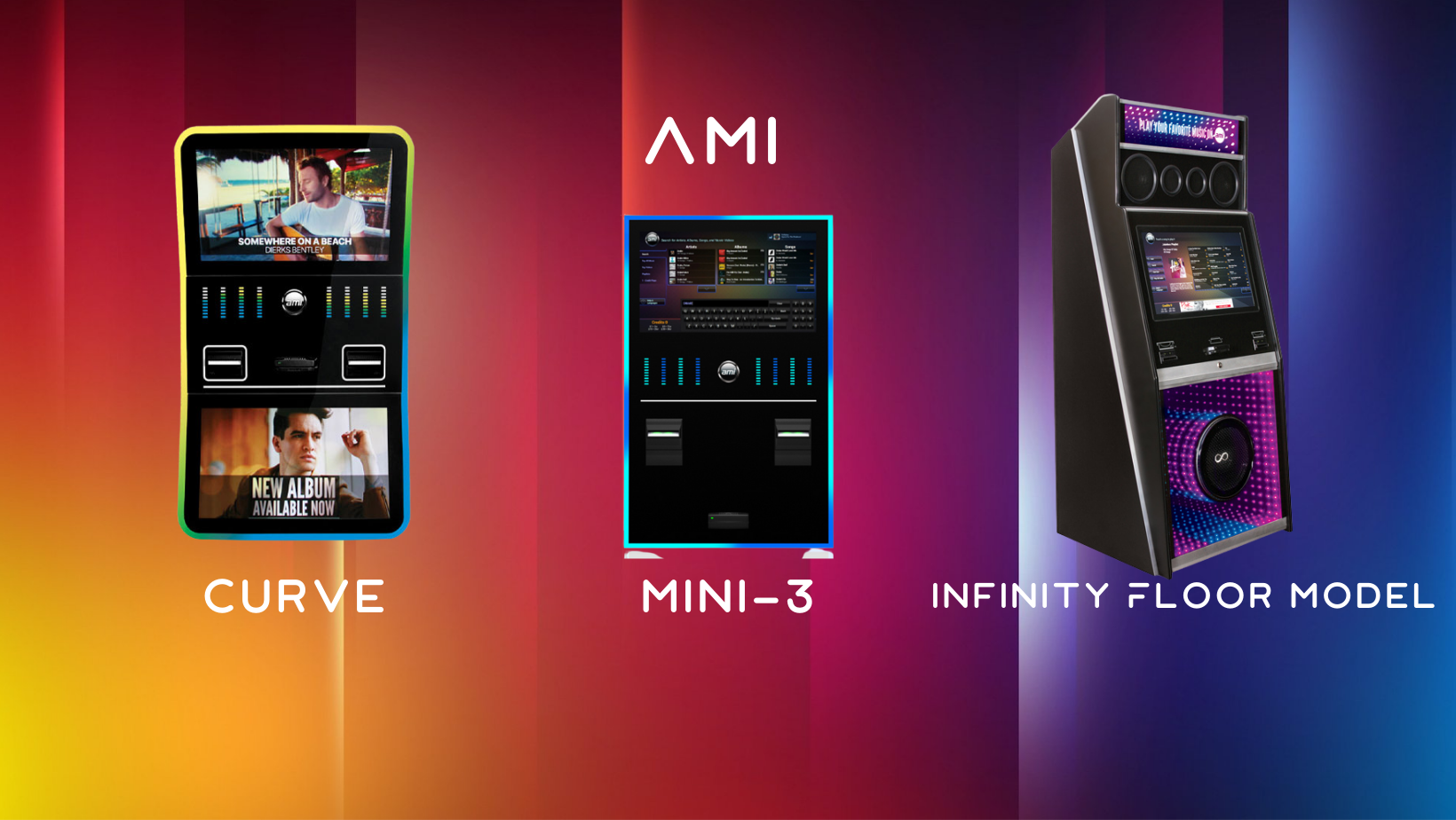 Full service provider for the TouchTunes lineup — Virtuo, Fusion, Angelina — and for AMI's Curve, Mini-3, and Infinity Floor Model. Hardwired internet, credit-card readers, karaoke-ready, mobile-app tipping — the works.